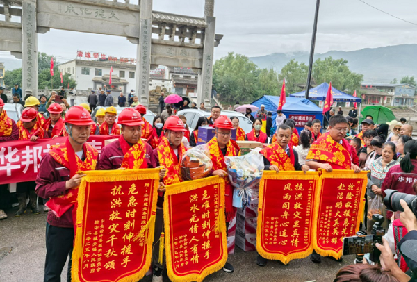 在欢送现场,榆中县人民政府及城关镇领导向华邦建投集团等企业代表授予“抗洪救灾千秋颂 危急时刻伸援手”等荣誉锦旗。老百姓精心准备的红色围巾与喜庆被面,被一一送到抢险队员手中;现场群众自发送出自家的馍馍、水果、蔬菜,质朴的礼物饱含深情。一位市民眼含热泪说道:“感谢你们不舍昼夜帮助我们重建家园,这些吃的都是我们的心意!”