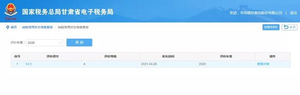 近日,甘肃省税务局网站公示,华邦建投集团被评为甘肃省2020年度纳税信用等级A级企业,这是自2017年以来,华邦建投连续四年被评为A级企业。这是税务机关对公司依法纳税、诚信纳税工作的高度肯定及认可。
